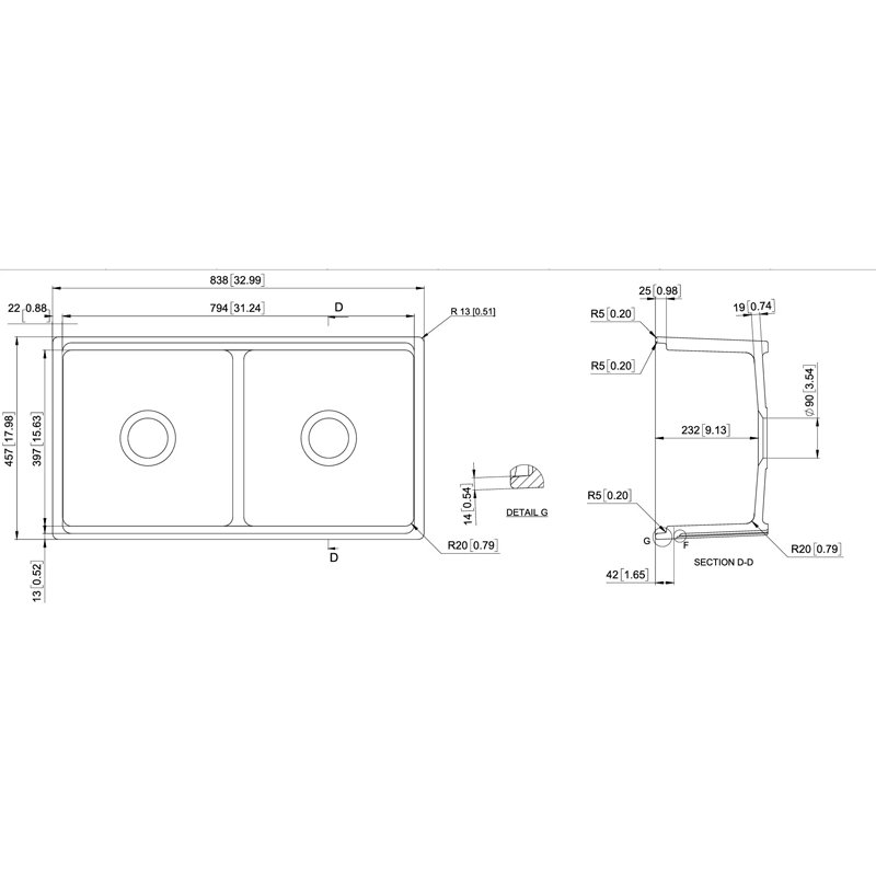 Carysil Fine Fireclay Double Bowl 838 x 457 x 232mm